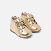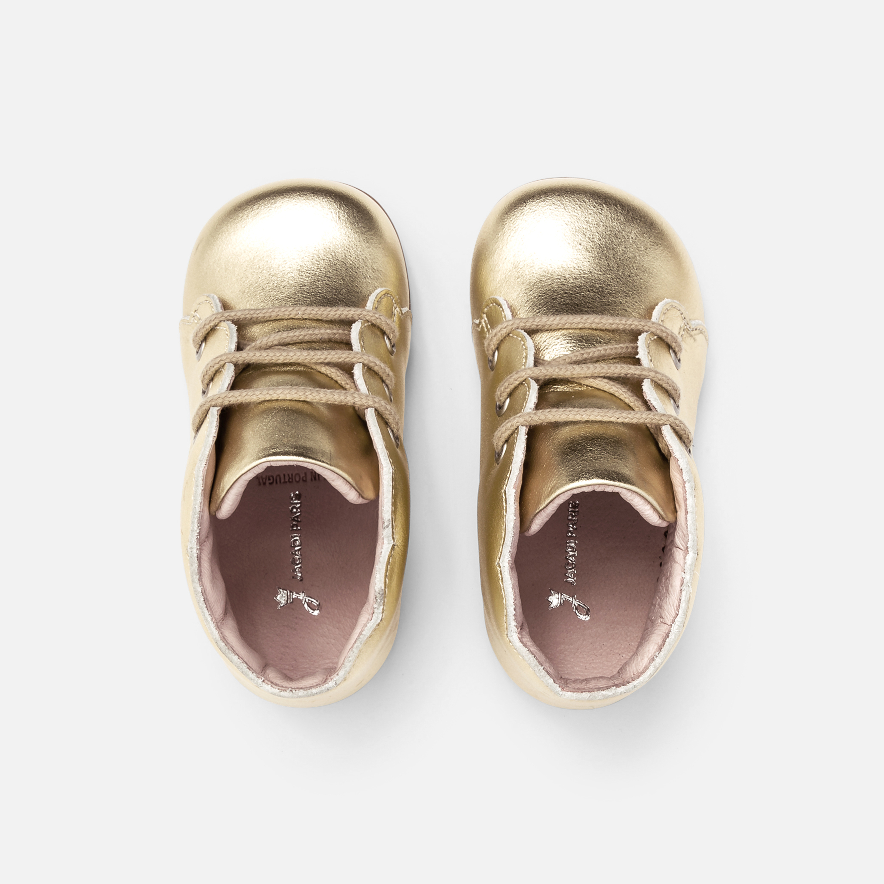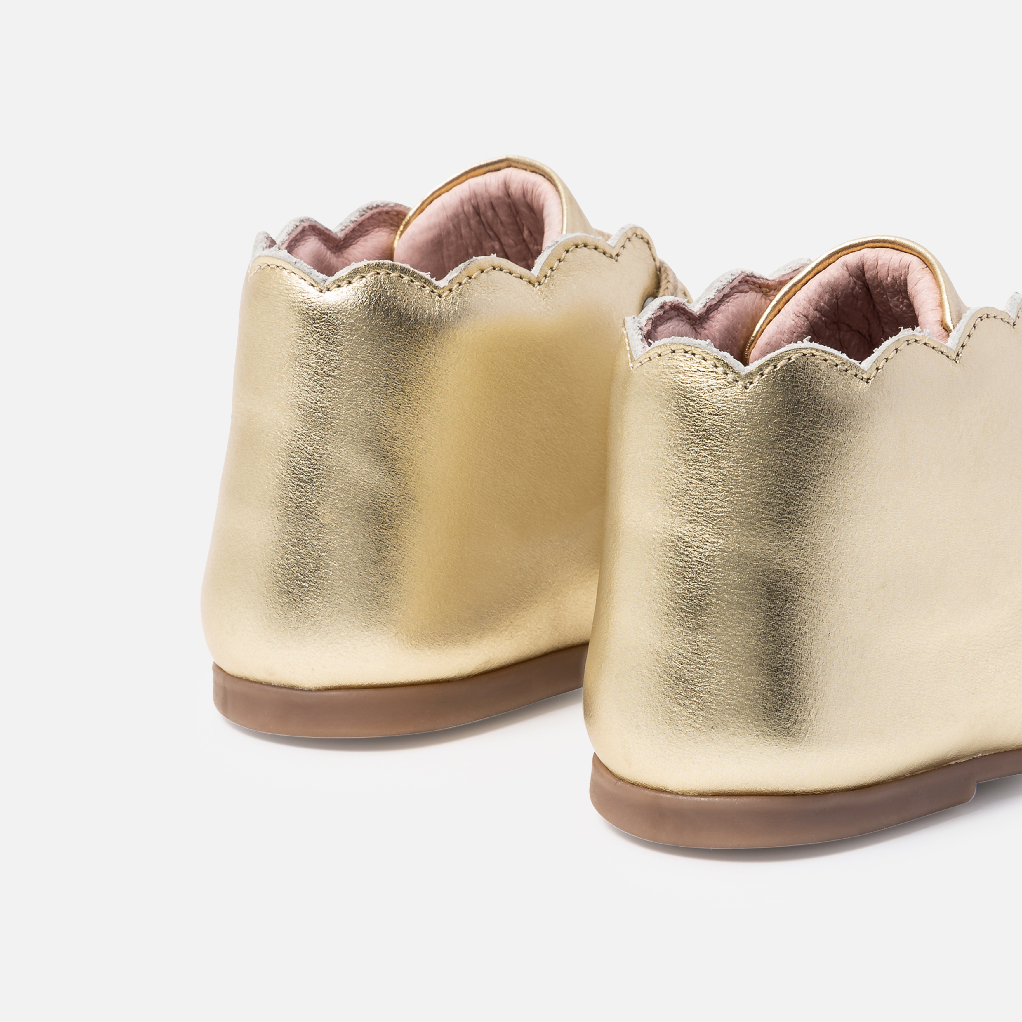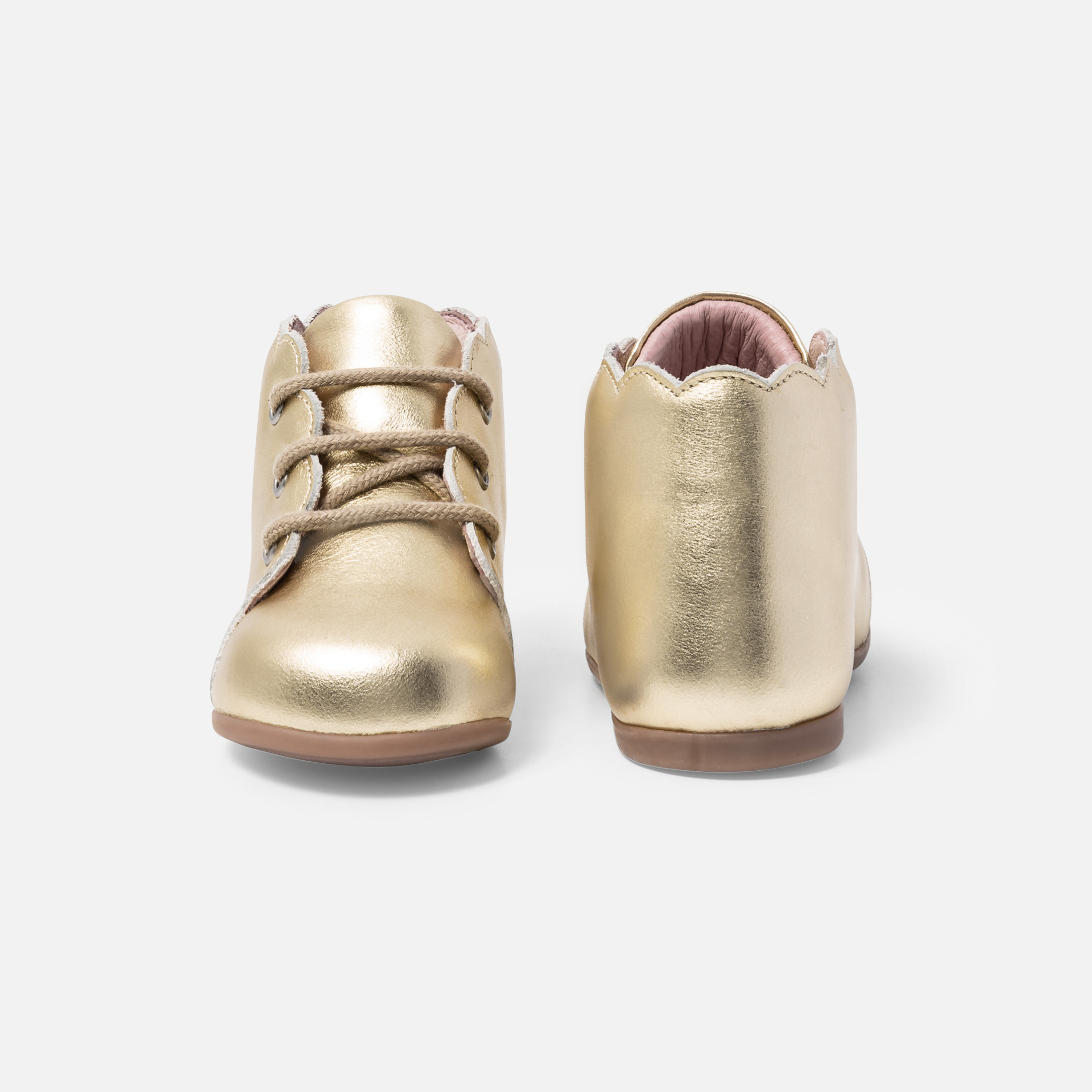 Pensati per accompagnare i primi passi delle bimbe, gli scarponcini di questa stagione puntano sulla modernità di un bel cuoio dorato. Ornati di graziosi smerli e facili da infilare grazie all'ampia apertura, completeranno look da cerimonia e outfit quotidiani con originalità.